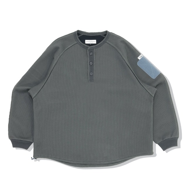土臭く柔らかなクタっとした印象のサーマルアイテムを真逆のモダンな表情にアウトプットしたアイテム。 サーマルとジャージ素材をボンディングして、柔らかくも、しっかりとしたシルエットの出るオリジナルファブリックを作成。 カットオフ仕様の縫い代を表面に出し、エルボーパッチラインをミニマムに表現しました。 裾部分にはアジャスター付きドローコードを配置し、シルエット変更が可能。 同生地のModern Thermal Wide Pantsと合わせてセットアップとして着用頂けます。 SIZE:FREE SIZE/ 肩幅 / 身幅 / 着丈 / 裄丈 FREE / -- / 67 / 75 / 88 こちらのページのアイテムは【BLACK】になります。 着用モデル 176cm56kg LOOKモデル 185cm FREEサイズ着用