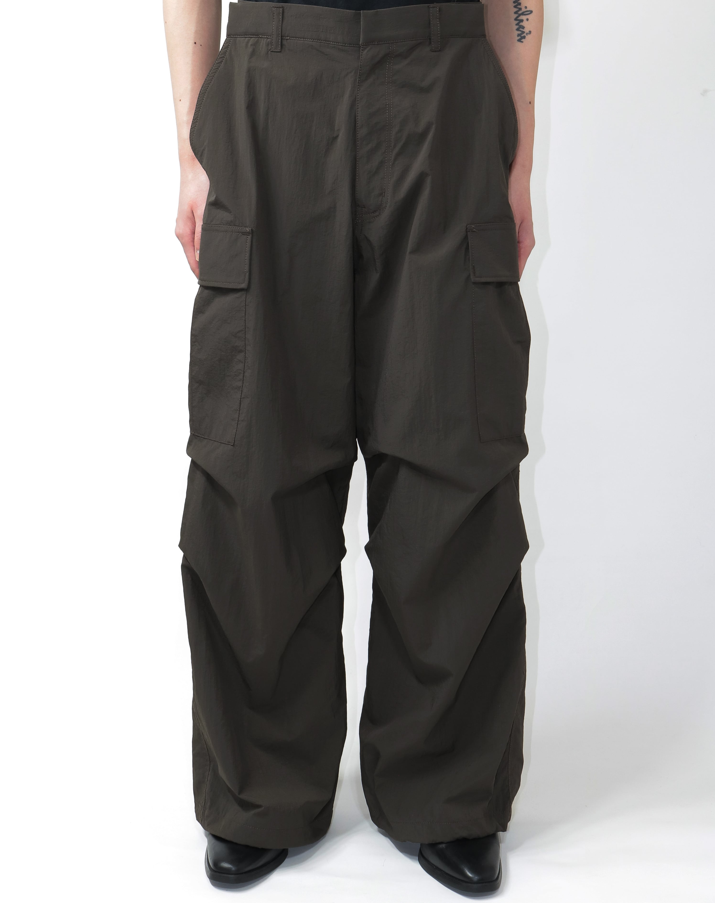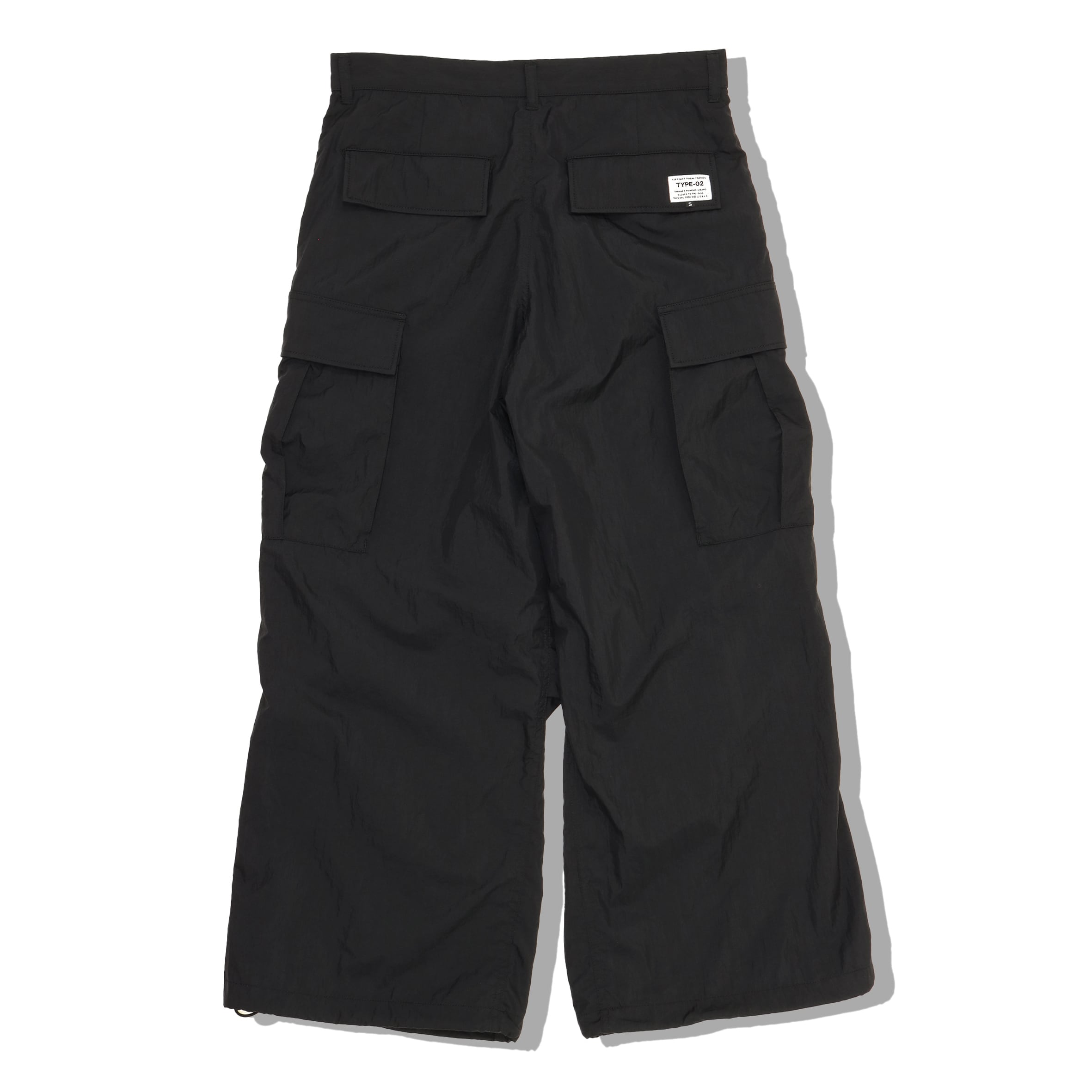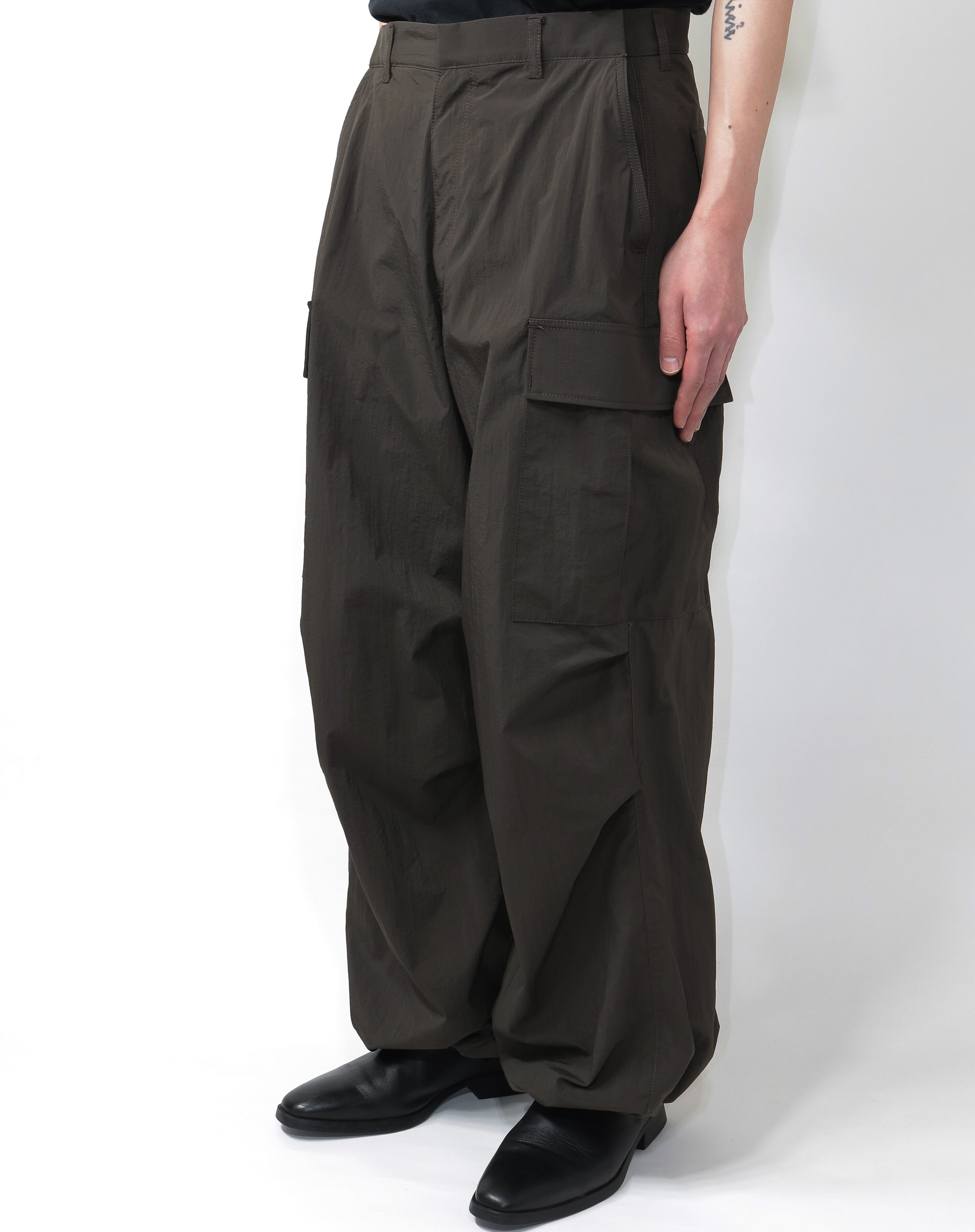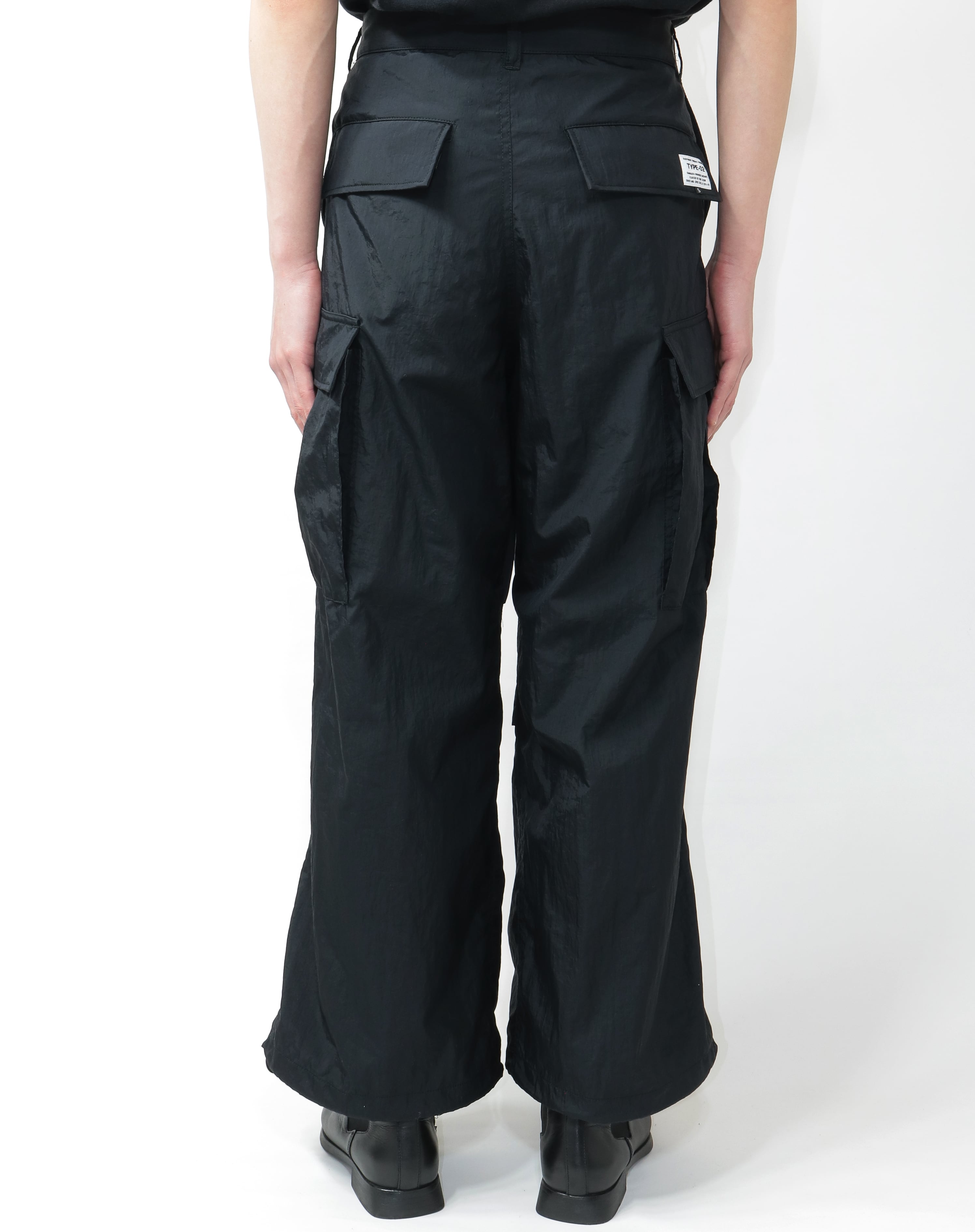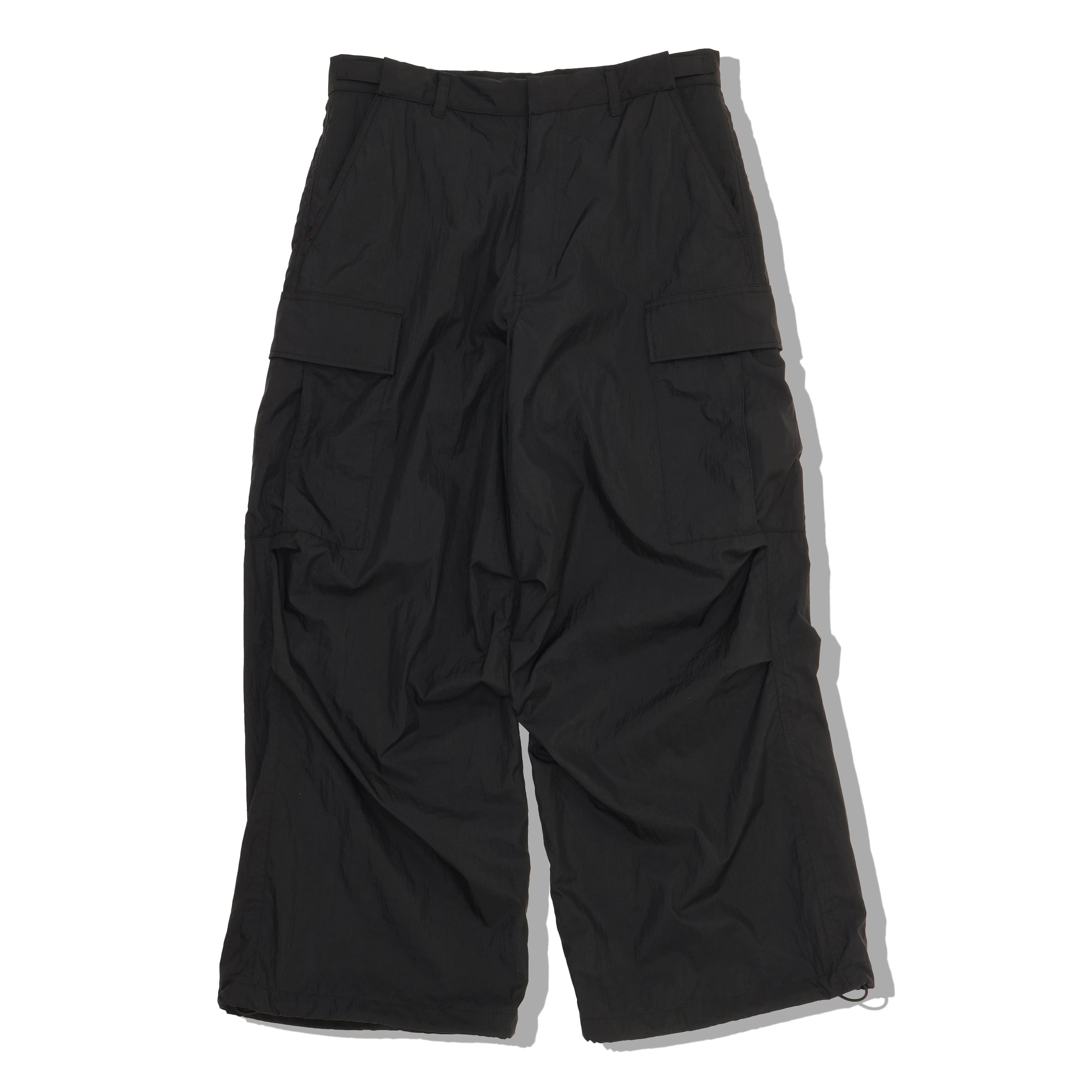 撥水機能のあるワッシャーナイロン生地を使用したワイドストレートシルエットのカーゴパンツ。